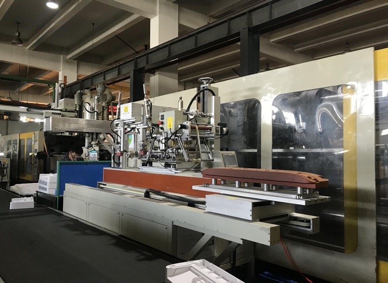 空調(diào)外殼配合注塑機(jī)械手實(shí)現(xiàn)自動(dòng)印刷自動(dòng)燙金